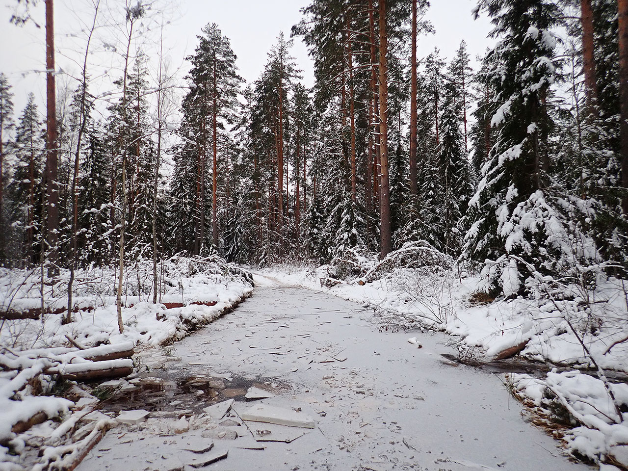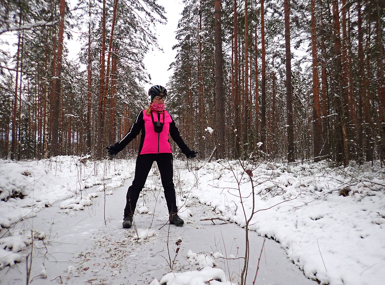 После выложенной фотки и подведения итогов по прогнозам, трек пришлось безжалостно кастрировать, ибо нечего! :D На самом деле было понятно, что с размахом проехать по сухому морозцу там где подсыпало уже на нуле снежка, пусти и немного, см5-8, уже не получится, травяного покрытия на пунктирах там достаточно и ехать уже будет не в радость, а в тягость, тем более что и не всегда видно, что под ним таится. Ну и плюс ледок. Насчет него у меня иллюзий не было, поехала на шиповке и как не пожалела ни разу, хотя реально пригодилась она процентов 30-40, но без нее было бы более чем грустно, ну и стремновато (вот в этой покатушке Вадимка может подтвердить как оно было viewtopic.php?f=2&t=2272020-12-09 Тихомировщина-р.Масельга-бол.Василюхин Мох-ур.Боз-ур.Горка-оз.Горское-Тихомировщина :) ) На проселках ухабистый, подсыпанный снегом гололед, в лесу где разливы и проехало авто колотый смерзшийся лед блинами, потрескивающий и ненадежный для упитышей, я свои 56кг прокатывала по нему, но с неприятным чувством) Зато вдали от всего этого безобразия, там где ничего не ездило и не накатывало, ровный свежий лед за 2-3 суток, 3см, меня держал чОтко, ехать было в радость. Видео ниже :) Снег же на удивление не был пухляком, я бы сказала, что скорее слежавшийся (но нем мокрый), контакты периодически залипали. Солнца обещанного не было совсем, что весьма обидно, сплошная межсезонная унылость, мечта Хори Грызликова :)