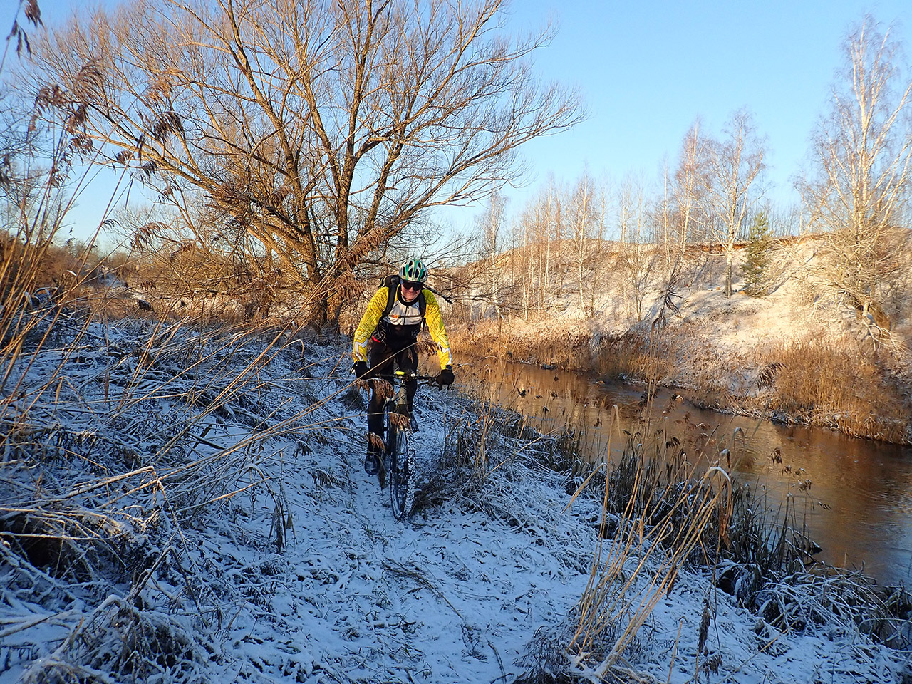 Ну и брод, половина мед, половина унесет :lol: Накануне вечером обговорили этот волнующий и острый в декабре момент перехода. Без него маршрут был бы неполным. Чтобы не повторять давнишнего неприятного перехода в середине октября (тогда мне было выше колена и шла с дрыном, ибо течение было), решено было очень высокой подружке обмотать ноги по самое это самое стрейчем, перейти самой с велом, а потом со мной на закорках и еще потом с моим велом :lol: Но реальность оказалась гораздо суровей. Воды в реке было гораздо больше, глубже и дно ушатали шишиги и квадры. Уж не знаю как летом, но на этот день было очень мутно :) К тому же и обмотка дешевая и рвущаяся была. Когда завершили чертыхаясь превращения из человека в киборга у последнего чуть терпение не лопнуло :) От берега было пройдено шага четыре и не было твердого дна, вязкая муть, дальше можно было бы и ввалиться. Глубина при этом была чуть выше колена при росте 196см.