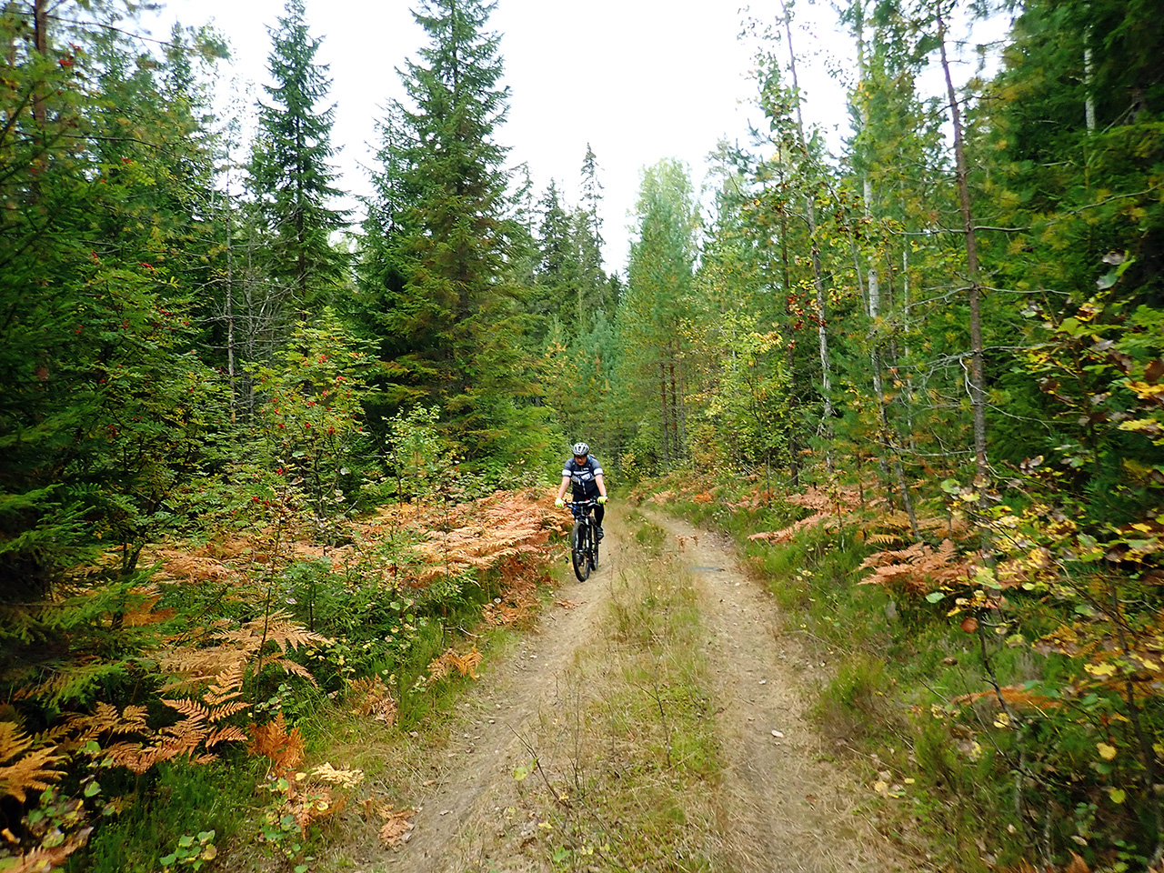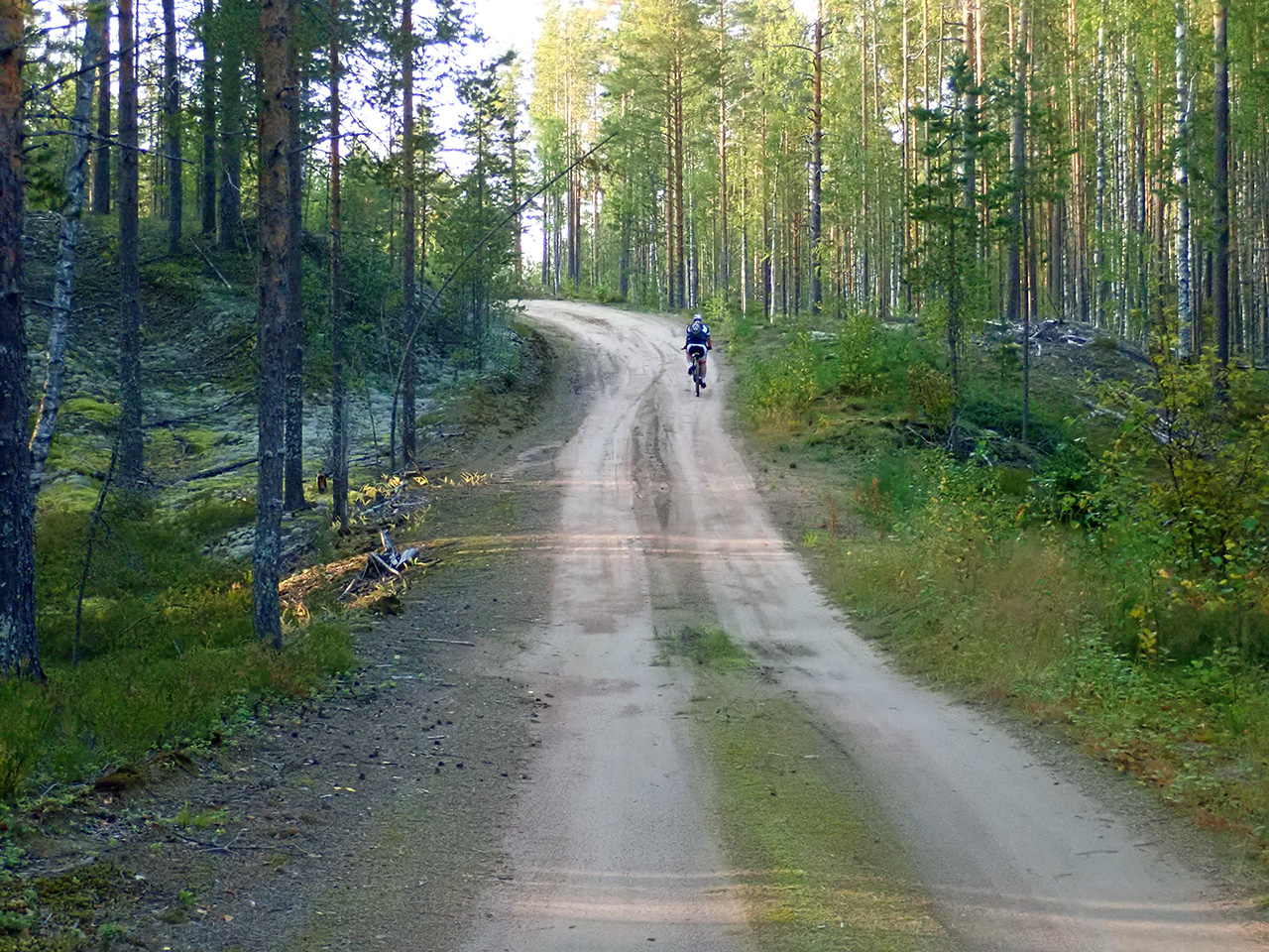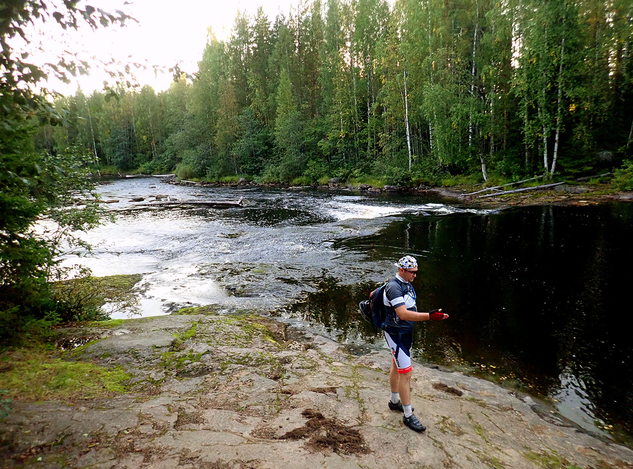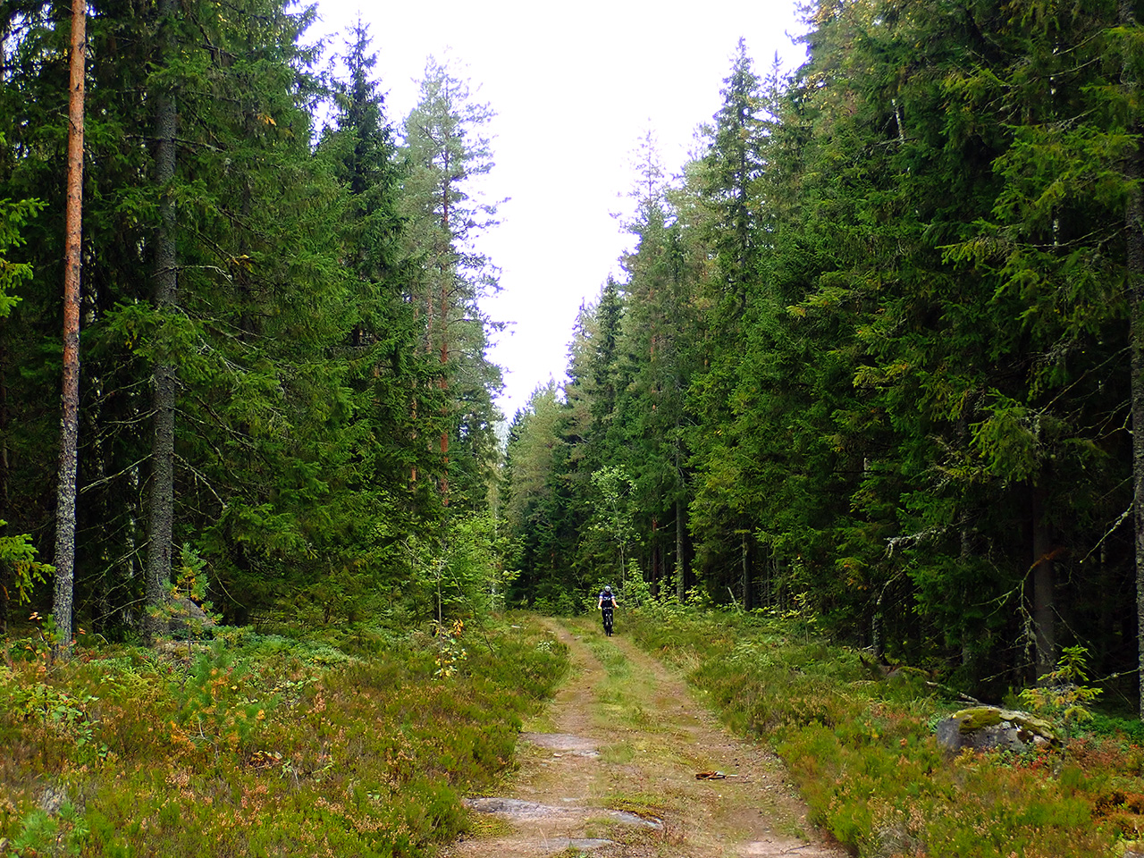 Погода на день катания обещалась быть томной, тобишь облачность с прояснениями и солнце уже во второй половине дня, что было весьма на руку, так как очень высокая влажность даже при утренних +14С (стартовали в 9 утра) ощущалась не очень приятно, а днем на +20С и вовсе не комфортно для катания по пересеченке. Так что лишние теплые вещи были до вечера убраны в рюкзаки. К полудню влажность убралась наконец вон и лично мне задышалось легко и свободно. Ехать налегке по шикарным каменистым лесным дорогам, взлетая то вверх, то вниз, беспрестанно восхищаясь удивительно красивому и постоянно меняющемуся ландшафту было просто в радость. Тут тебе и красивейшие боры и высокие печальные ели, где то березки и рябинки где то вырубки и осинки, а где то скалы и глазастые озерИнки, да прячущиеся моховые болотные низинки