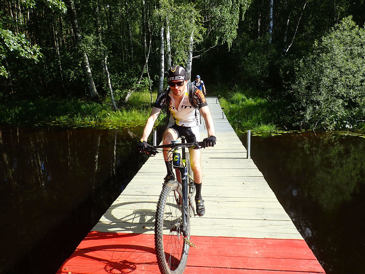 Было очень интересно наблюдать, как меняется лес в зависимости от высоты рельефа: только что ты ехал среди сосен и упивался запахом хвои и смол, но вот дорога пошла сквозь низину и ты уже оказался в густом ельнике, куда едва пробивается солнечный свет. Становится мрачно, таинственно и немного зловеще :) Начинаешь чувствовать себя персонажем сказки :) Не проходит мгновения и ты снова утопаешь в лучах солнца. Где-то в дали за деревьями виднеется озеро, на глади которого вовсю резвятся солнечные зайчики. Дорога медленно забирается на гору, заставляя немного попыхтеть, но в тоже время давая возможность спокойно оглядеться и умиротвориться от увиденного :)