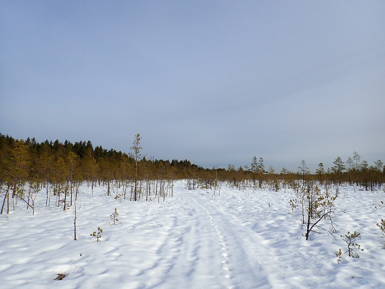 Так как снегоходок не было, ехать можно было как душе угодно, но по треку, он должен был вывести на то место, где должны были быть снегоходные следы.Так оно и было, сначала тянула целину, восхищаясь неповторимыми болотными пейзажами и подъезжая иногда к охотничьим засидкам, ветхим и не очень, зависело от того, по какому болоту ехала. Заодно и пришло понимание, когда увидела наконец заснеженную старую снегоходку со следами дикого зверья, что заезжают на эти болота теперь совсем с другого места