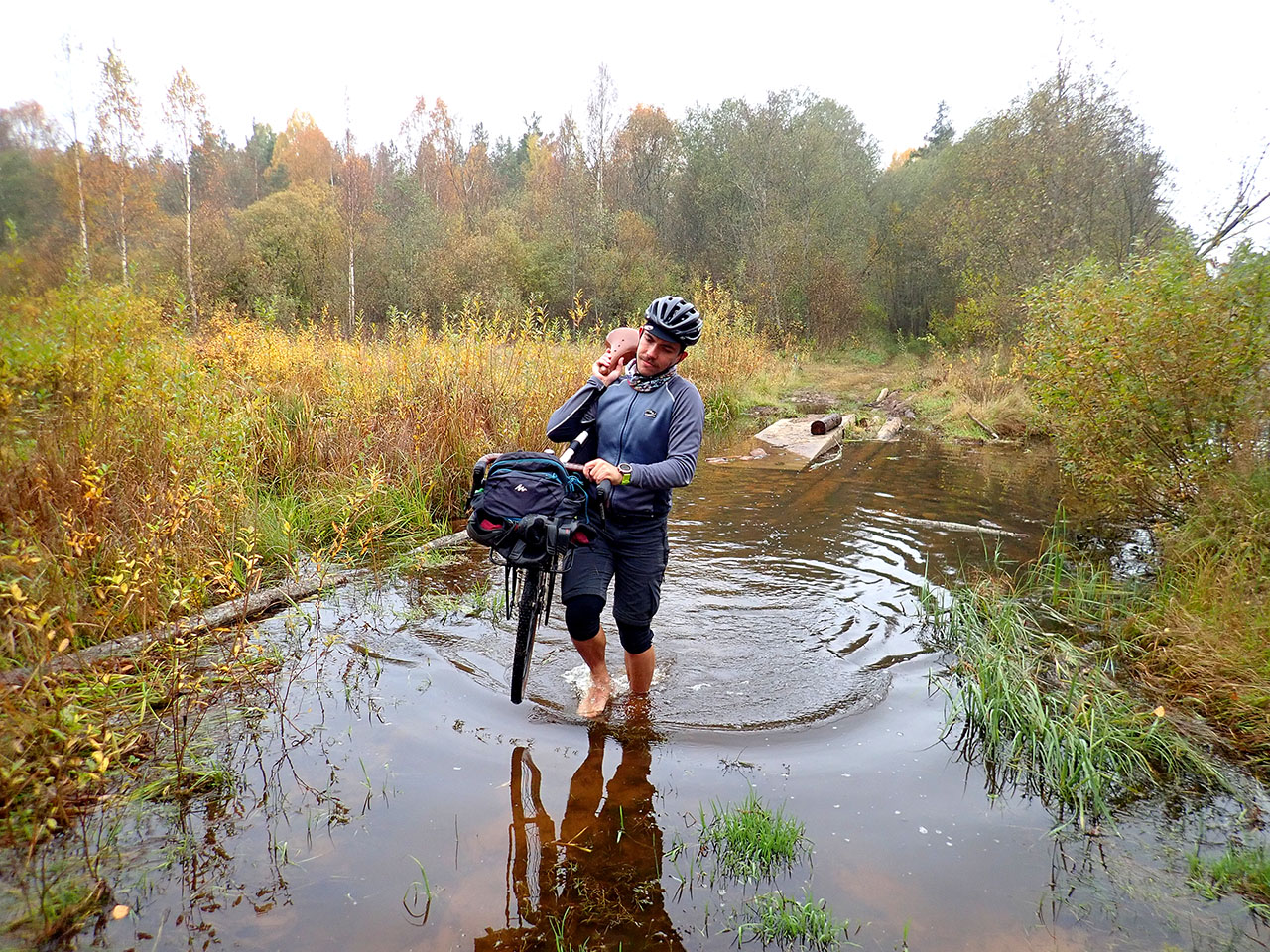 чтоб приключение было настоящим должен быть брод, к сожалению перейти по бревнам не удалось, водичка из ручья, подпитываемого рекой шегра, поднялась, но парни мужественно перешли брод, а я паразитически как всегда проехала на любезно предоставленной широкой спине