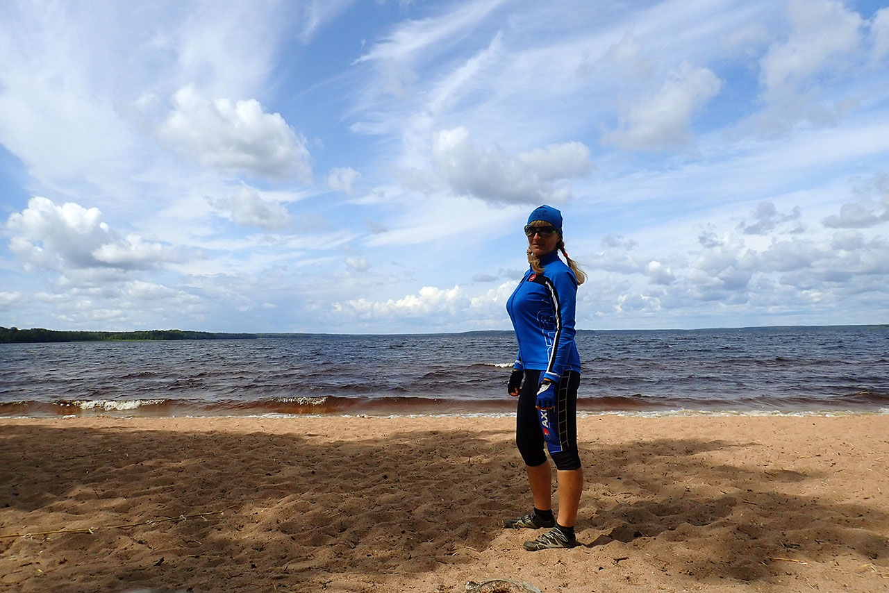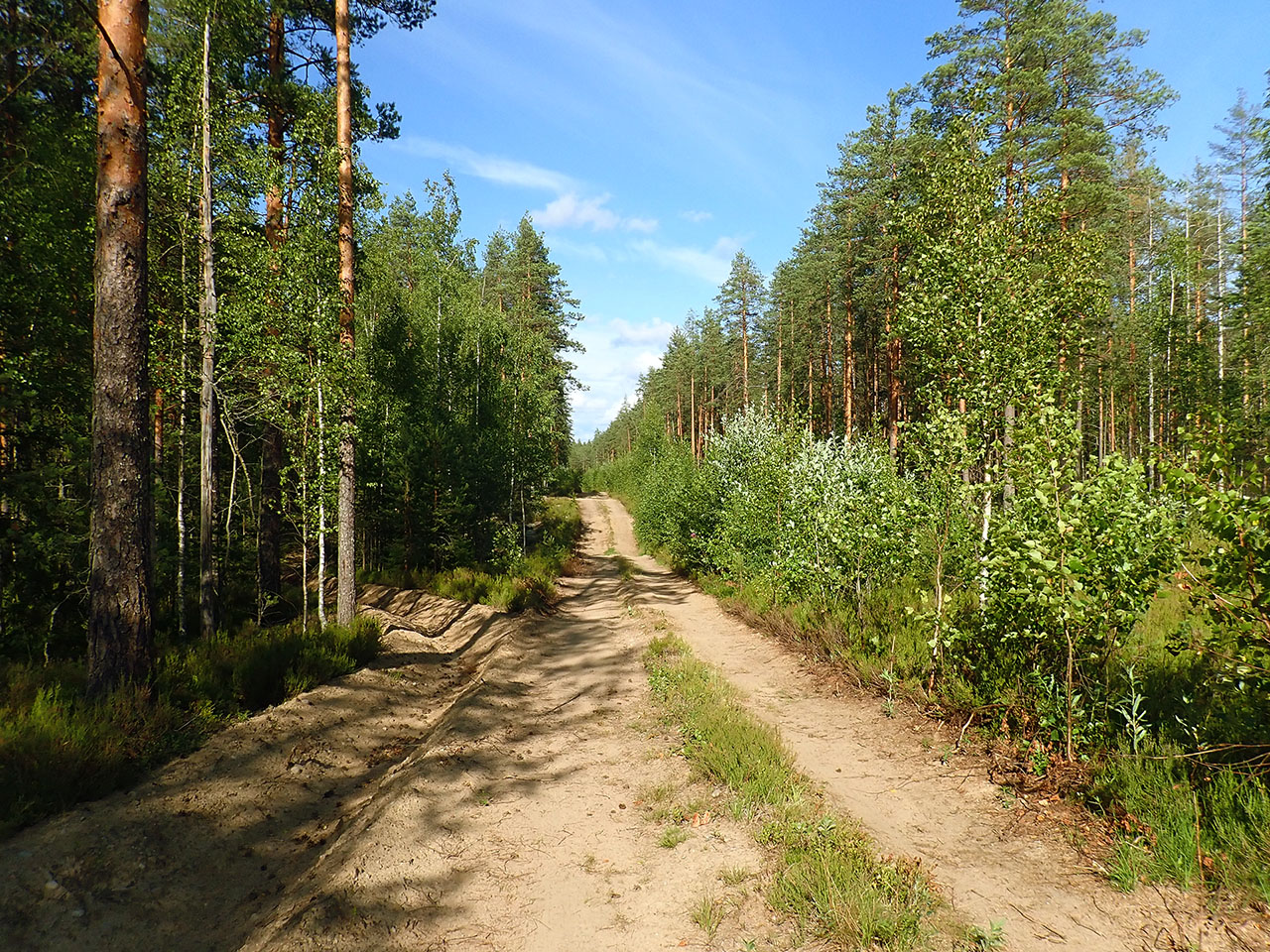 Пришлось в наказание прихватить асфальтовую часть в км5 :) По встречной дороге видела встречающихся одиноких страдальцев с каких то соревнований, с мученическими выражениями лиц спешащих к финишу, который я проехала, сказав, что в не зачета :) Учитывая, что в этот день ветерок был местами ну очень сильный, роза ветров то как раз благоволила к приозерской жд ветке, а так получалось то встречно-боковой, то иногда в спину, а то и встречный-поперечный, хорошо что в лесу, там смягчалось все таки, хотя неплохо выдувало туннельно :) Забавно было видеть, проезжая крупные озера, как люди от ветра прятались по кустам и в палатках, а на пляже загорали в одеждах. Купающихся не видела, на таком ветерке не шибко то жарко было :) Дороги все хорошо подсохли, иногда было хоть и не критично, но пыльновато. Грибов, малины и земляники замечено не было, только грибники :) , черника вот была везде, она бессмертная! :)