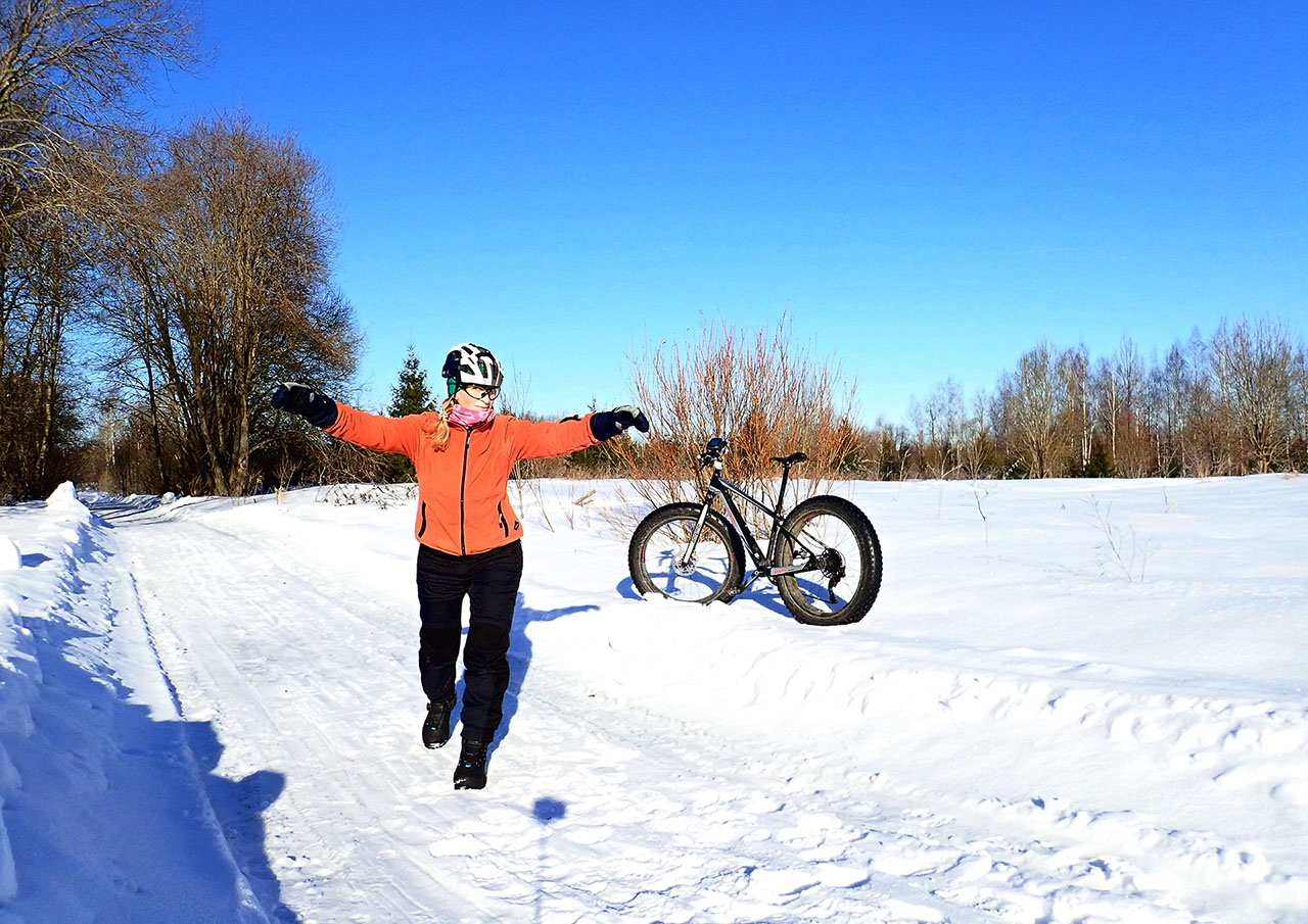 Так как места знакомые и дороги одни и те же за годы катаний, с разнице лишь по сезону и погоде, то на этот день было больше похоже на февраль пятилетней давности, разве что тогда подсыпавший свежий снег на старых, но держащих велосипед дорогах был мягкий (тогда не было резких перепадов на оттепель), а в этот раз с корочкой, похрустывающей даже на проезженных дорогах. Там где приходилось ехать по старым снегоходкам, читающимся под целиной, то потеть приходилось изрядно, разрезая верхний слой наста со снежком тяжеловатым под ним, пульс зашкаливал изрядно. Дрищам там делать точно было б нечего, бублики еще цеплялись с усилием за жизнь :) Вправо-влево от дороги ввалиться по колено можно, сугробы мощные никуда не делись. Повезло, координацию не потеряла, воткнуться в сугробищА не удалось :D