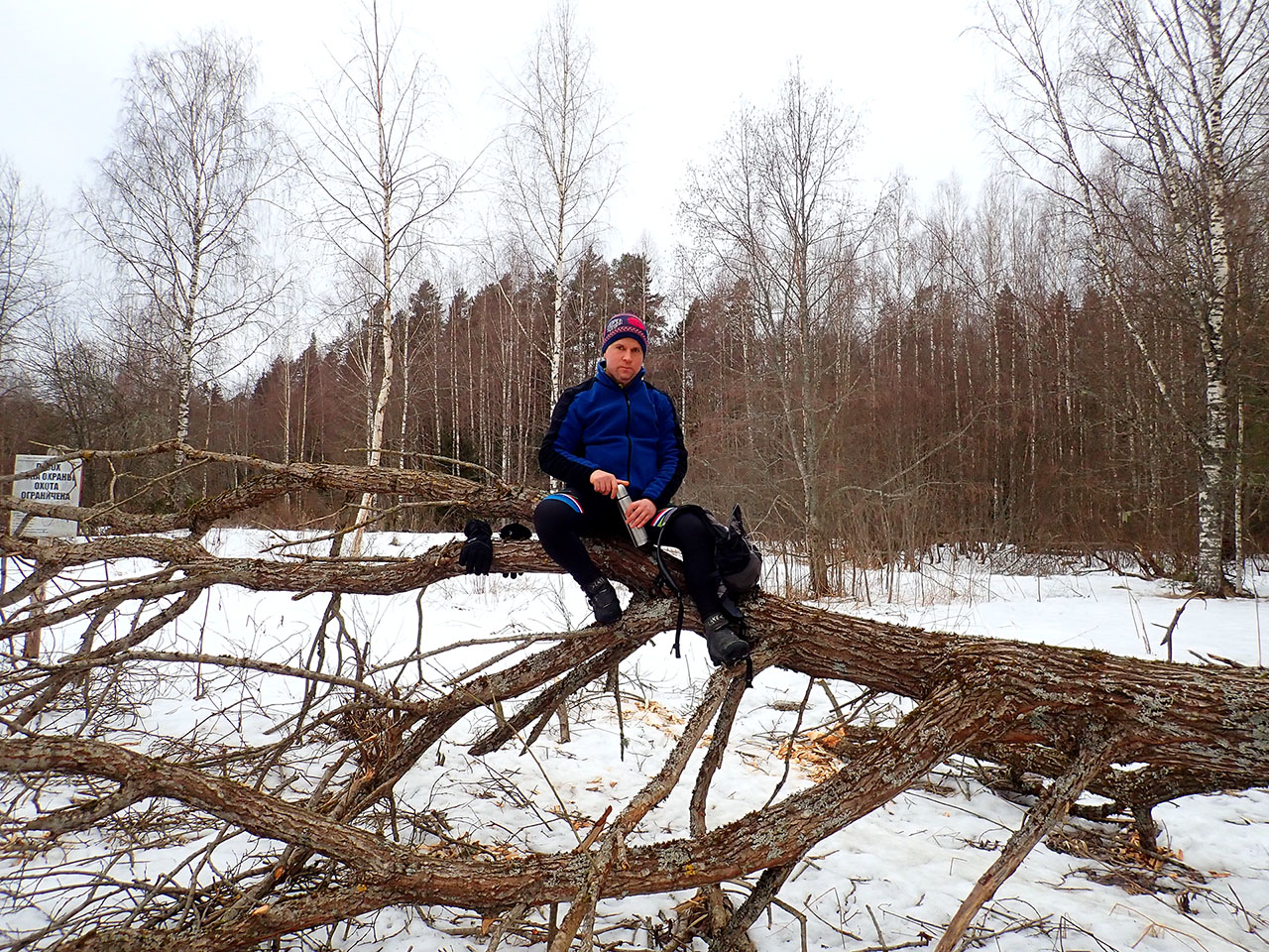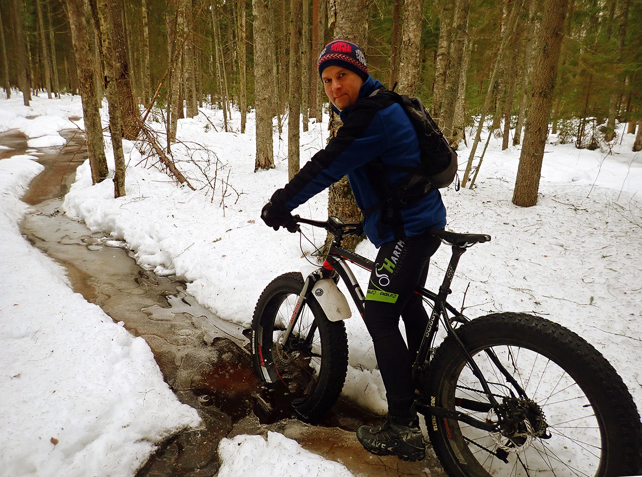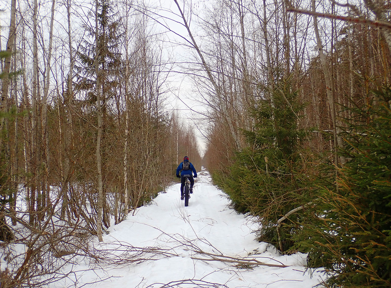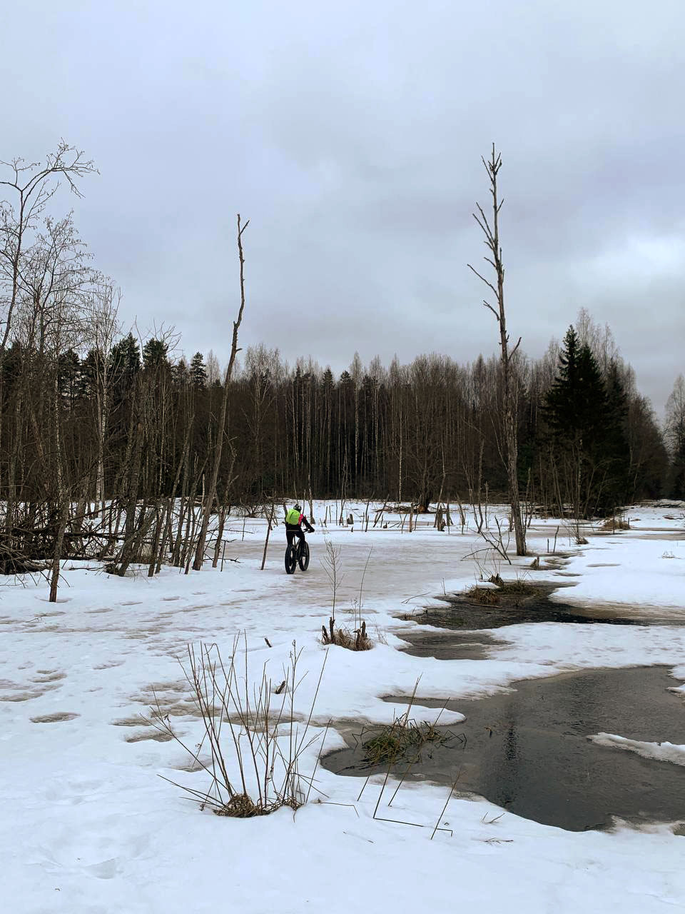 Заранее было понятно, что езда к болоту, там где есть ручьи и каналы из за аномального февраля могут дать текуху. В поездке днем раньше мы на болотце наблюдали такое явление и товарищи, катавшиеся недалече от тех мест фотки с болота прислали, полные живой воды и промоин. Так что ехать навылет губу заранее не катали, в запасе была закольцовка. И как показала в дальнейшем суровая реальность, приболотная территория к озеру уже "дышала". Сначала в лесу появились колеи с еще крепким прозрачным льдом, потом с желтым, а потоми и вовсе вода показалась впереди. Испытывать судьбу и рубиться в болото желания не было, слабоумие и отвага все же должны быть просчитаны