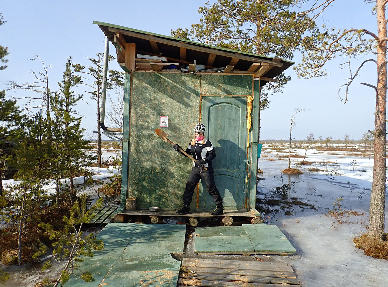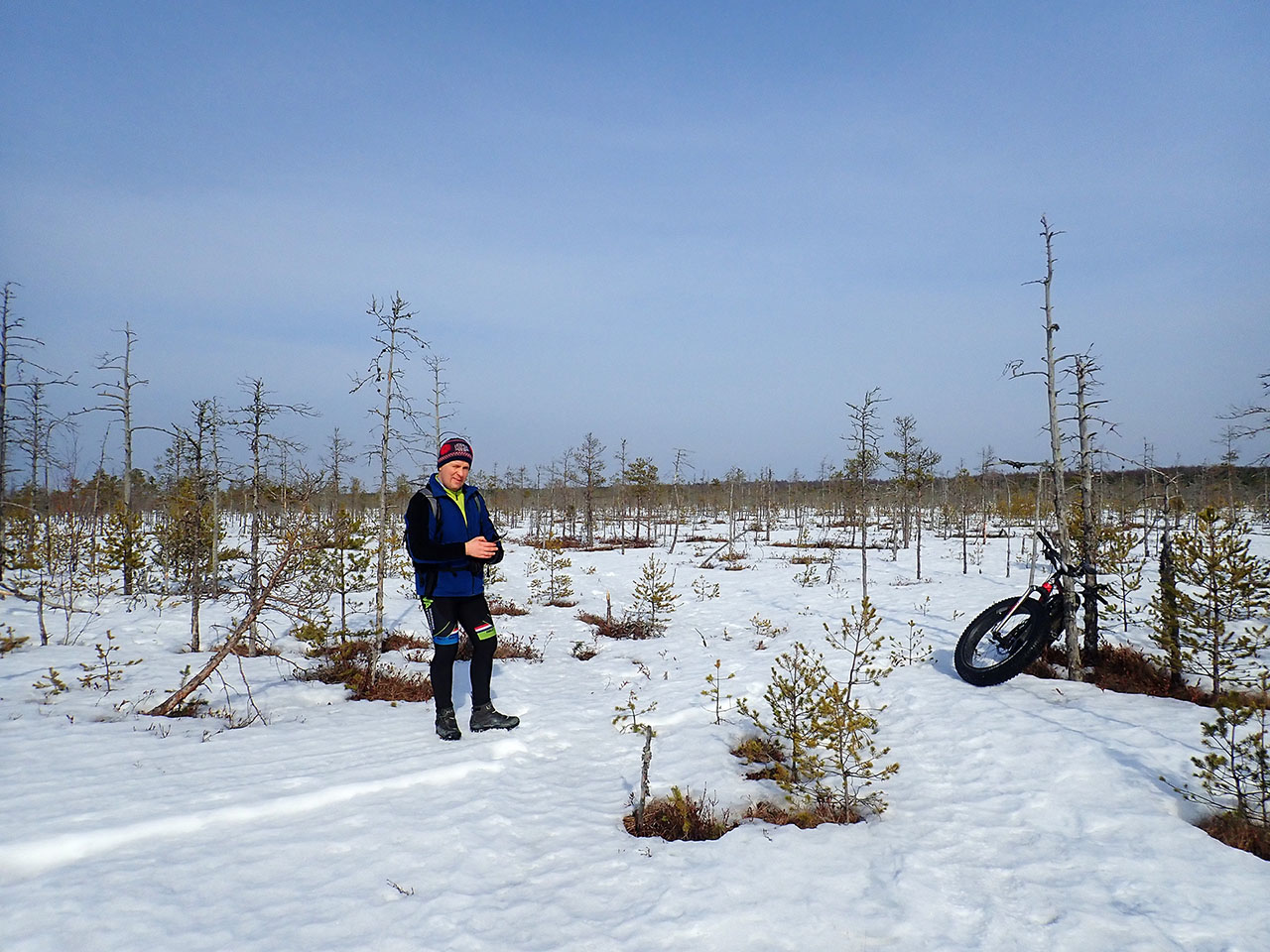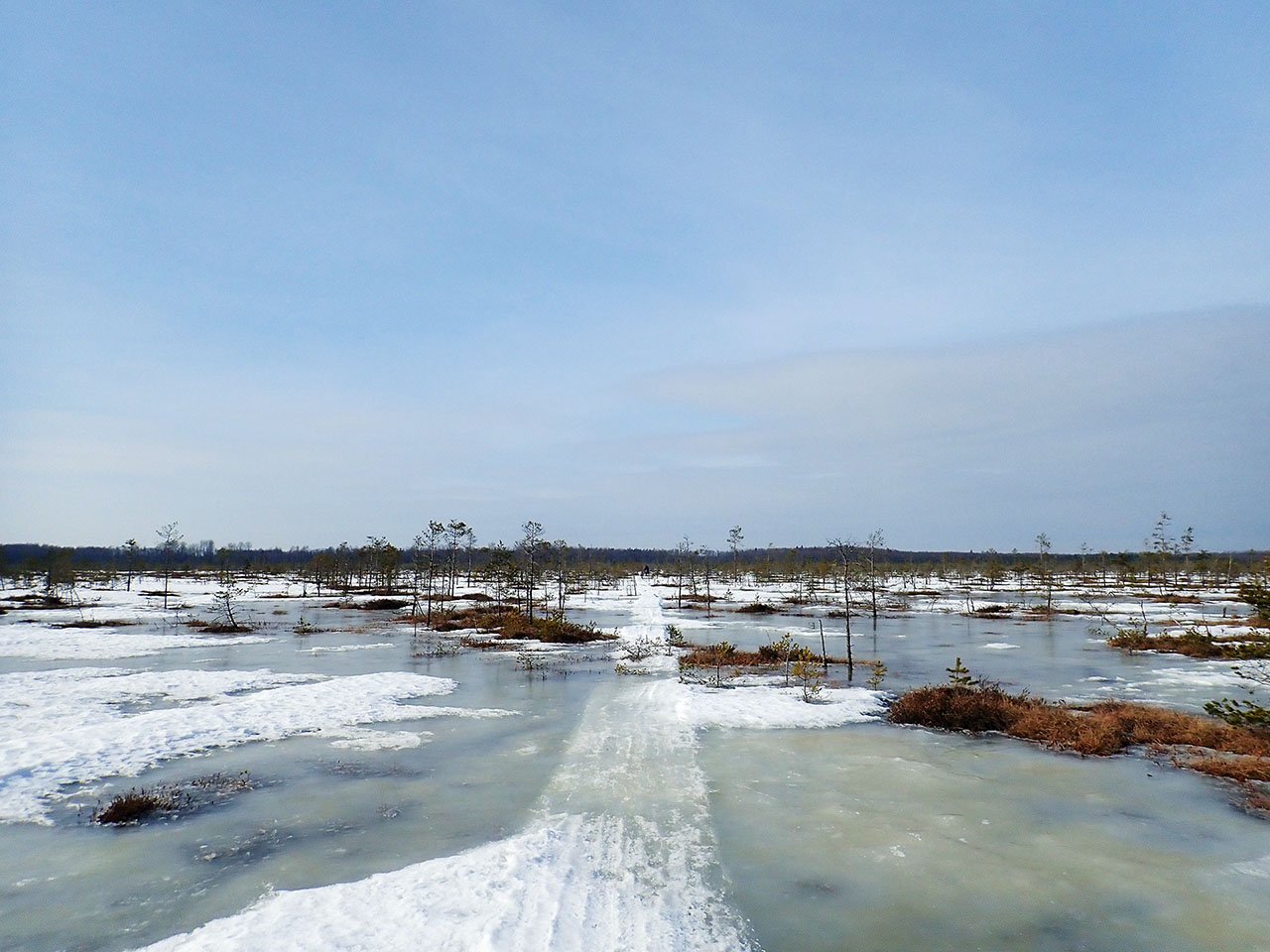 Но все таки расчет на общее время езды по болоту оказался верным и неприятный участок уже был в конце пути, именно тогда, когда появились первые снегоходки.