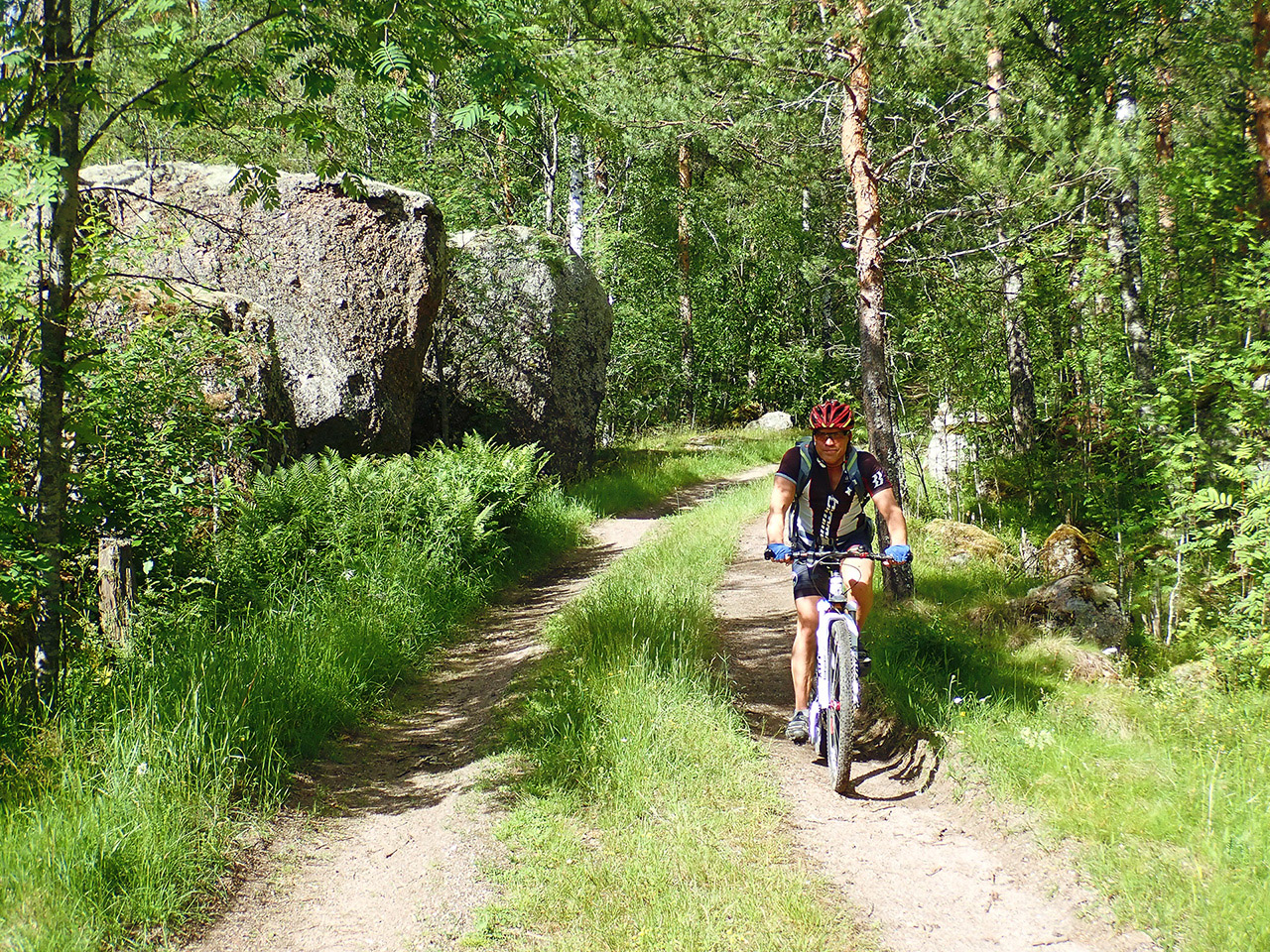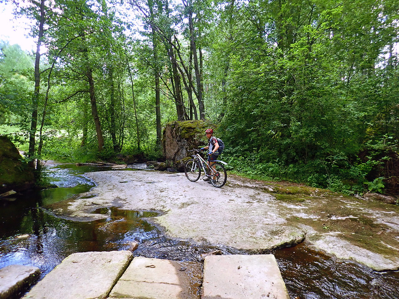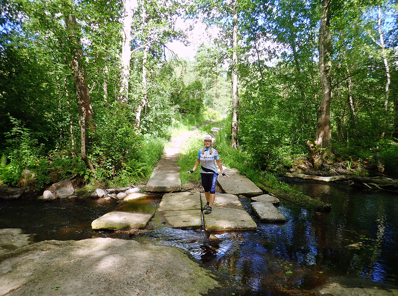 А вот самая хардкорная часть покорила наши сердца. Посреди видового каменистого ландшафта и полузаросших дорожек больше похожих на гламурные трейлы, бесконечно вверх-вниз с подзабившимися ногами и легкими (хоть жары особой не было +21С и тучки периодически набегали, влажность была высокая, 70-80%), одновременно восхищаясь природной красотой и думая, что надо было быть на голову совсем больной, чтоб ехать поспав за трое суток от силы часа четыре, вот она цена нашего любимого хитрого формата!:) Позволяешь себе один перекус минут на десять (после земляники) у озера без купаний (ну вот правда прохладная вода) км через 50, остальное выбор траектории бродов через протоки и туалетный лес, полный сказок и чудес