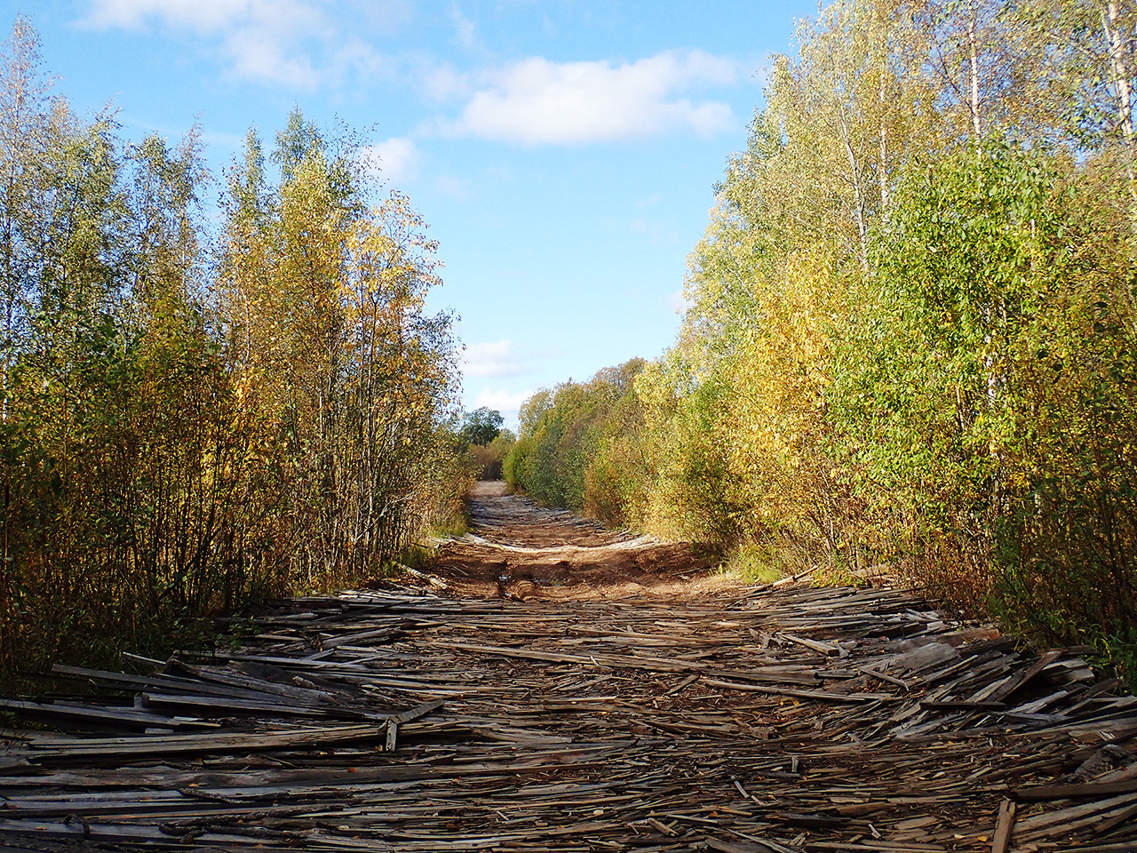 дороги из гати на добрую четверть поездки, это просто пунктирный тренд непростой местности. едется на подвесе вполне интересно и в пределах комфорта, благо доски не совсем мокрые, а только отсырели)
