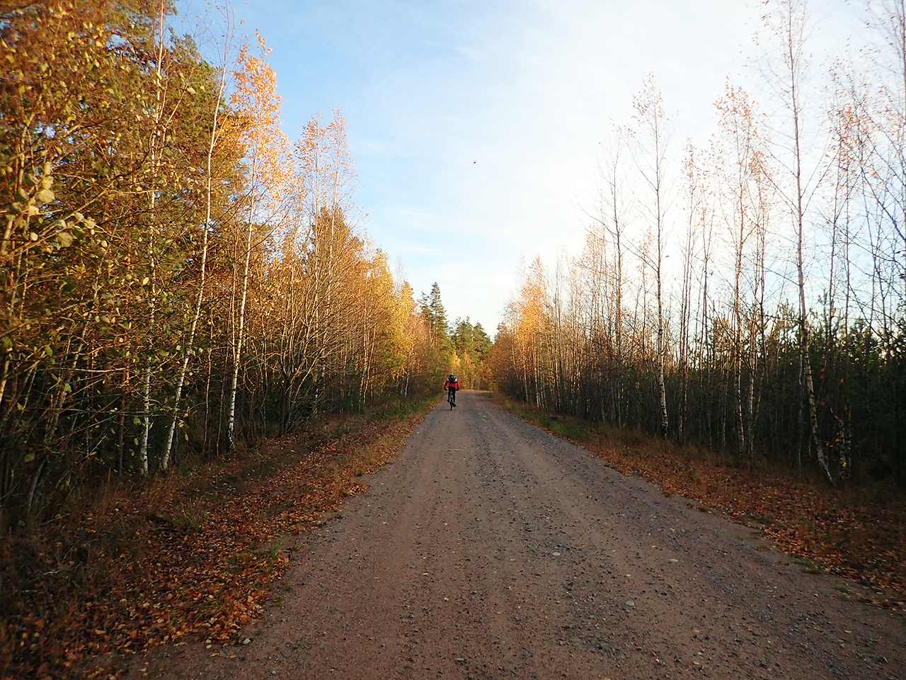 Изначально трек с этих моментов планировался с учетом старых маршрутов грунтами сразу к станции, но глядя на время и хорошо помня крученость (в буквальном смысле этой заключительной части км в 20), решила, что проще проехать по полигонной шикарной дороге, пусть и с тягунами, но без ковырялок и более быстрой, а там км 8 по шоцэ до станции, в аккурат до сумерек, на элку в 17.33. Это было правильное решение, поэтому за минут 10-15 финишировали в Каннельярви, удачно закольцевав маршрут и вобрав в себя все самые яркие краски и впечатления осеннего погожего денька и самое главное от дружеской компании! :)