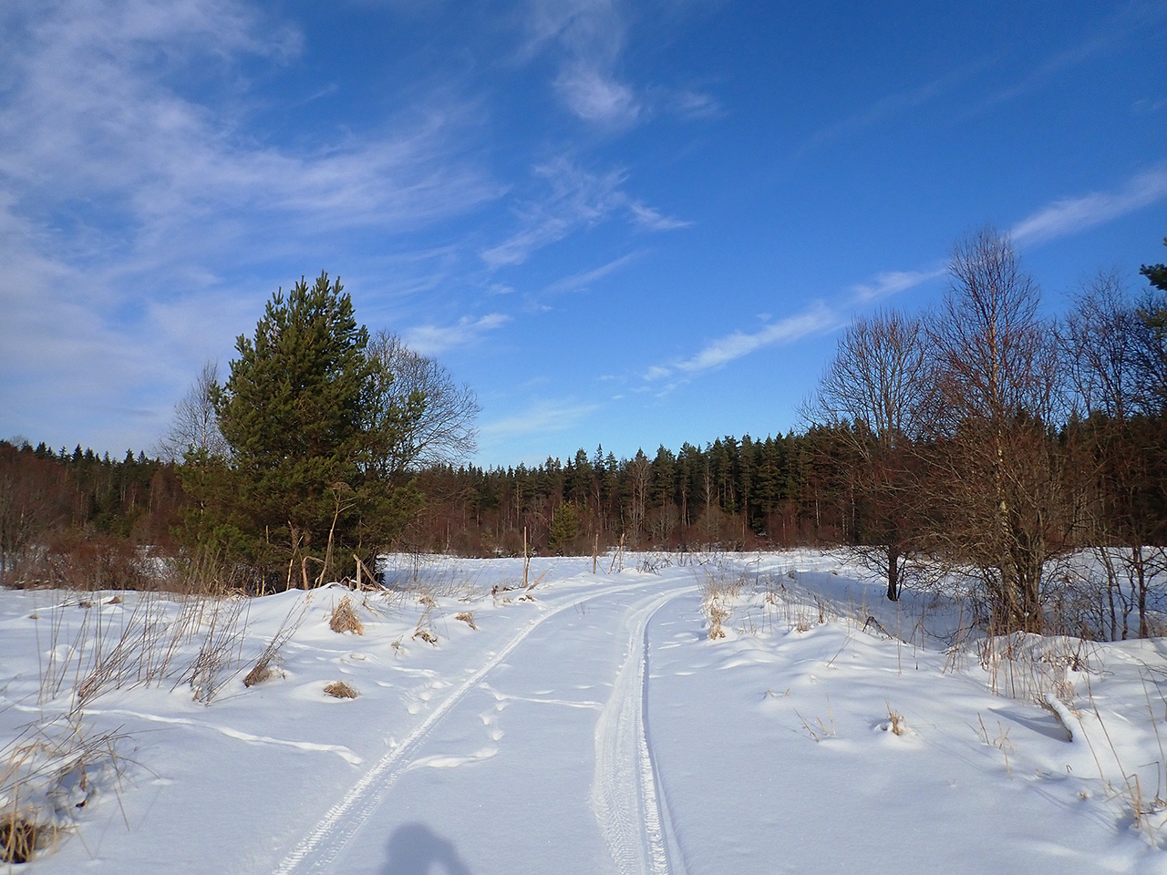 Заранее с моей старинной подружкой были обговорены все варианты, так как в дуэте был фэт и найнер и надо было уложиться часов в пять, чтобы пораньше приехать в город, что было целиком исполнено. Чтобы избежать шоцэ до ключевой точки по минимуму (там от него не денешься, если ехать этим маршрутом), ехали срезками, где не могли из за разной проходимости велов выезжали на шоцэ, а где просто разворачивали оглобли, так как дорога-пунктир была под целиной. По этой срезке мы в позапрошлой осенью удачно избежали ненужного объезда по шоцэ, но то была осень, а нынче на дворе наступила настоящая зима и снега дофига, пусть и ненадолго