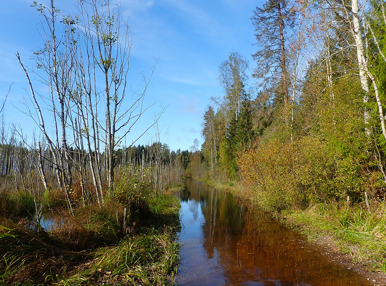 Ояярвинская дорожка) Помня, что в 21-ом году я там в месте разлива Севастьяновки на дорогу проехала посуху, а в 2022 метров 15 шла по колено по затопленной дороге (благо было +16С), в этот раз решила судьбу не испытывать и мы с товарищем взяли запасные носки, я лично бродовые, что дома без дела то лежат :) Пока ехали и была хорошая дорога, не считая мелких луж, обратили внимание, что река еще от Севастьянова больше выглядящая как канава в заболоченной местности как то странно выглядит. Было ощущение, что ее русло перекрыли для нужд находящегося там сельхозпредприятия. Подозрения оправдались, когда увидели истинный масштаб бедствия. Там воды на дороге уже было не 15 метров, а ближе к 100! :shock: На дорогу вливалось и болото и то что было рекой :lol: Товарищ сразу пошел в обход в лес на козью тропу, а я в носках с велом на руках вброд. Метров через 15 терпение лопнуло, горизонта этому разливу не было, а глубина стала увеличиваться, можно было и по самое это самое ввалиться :lol: Так что гордо показала воде знак из комбинации среднего пальца и выгребла на обочину. Спасибо носочкам, отработали, сняла, переодела то что благодаря им сберегала и пошла на тропу. Сразу скажу, она больше подходит для пешиков. Даже без груза и с легким велом тесно и не шибко приятно, благо обходная тропа метров 150, там не поймешь. Минут 20 надо закладывать при таких условиях.