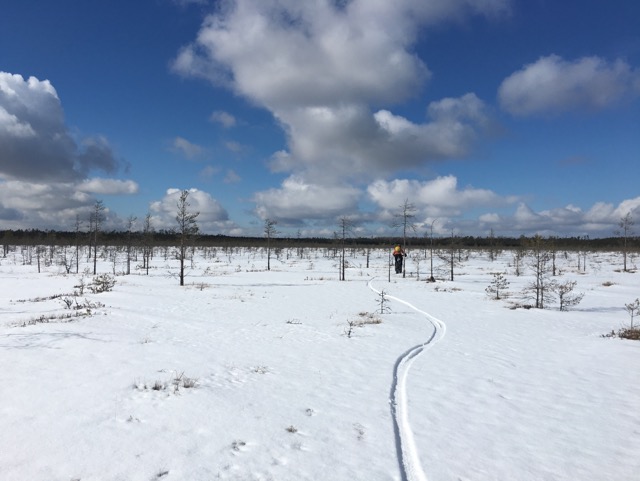 Повезло, что с утра солнца не было и по болотной целине можно было ехать, хоть и с напрягом (наста почти