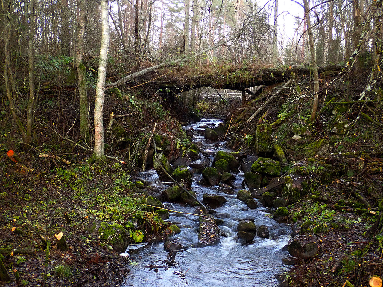 с подергиванием ноги:)) и очень атмосферный древний полуживой финский мостик с бурным потоком воды,