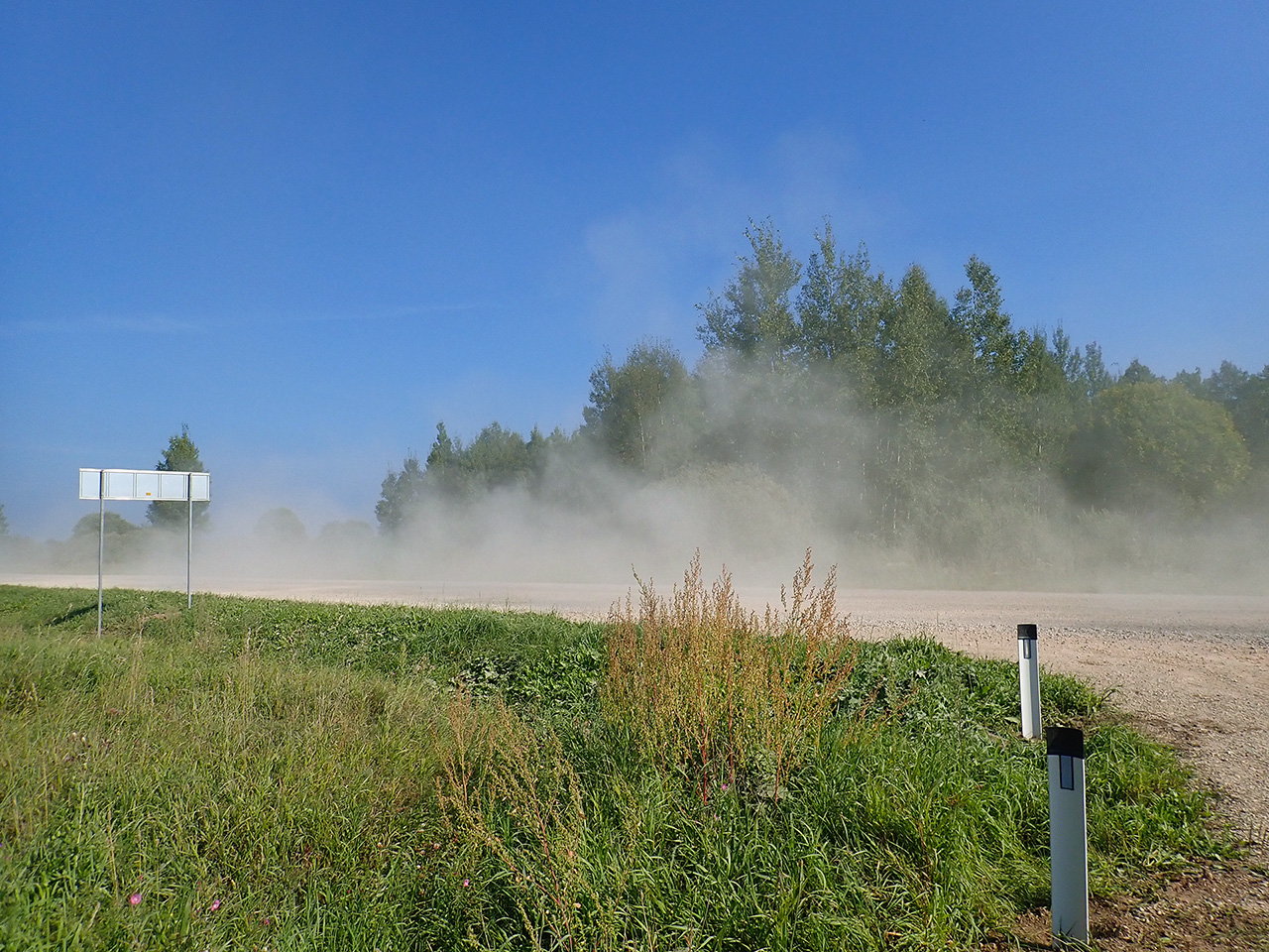 Дороги на всем протяжении маршрута большей частью полевые. Лесов там не шибко много, зато дороги грунтовые плотные, высушенные добела. Как ни странно в этих местах дождей давно не было. В лесах засуха, ни ягод ни грибов, там где проезжала. Когда недавно катались между Гдовом и Псковом с этим проблем не было, совсем. А после дождей там пески просто набухли так, что не могли уже воду впитывать, заважничали
