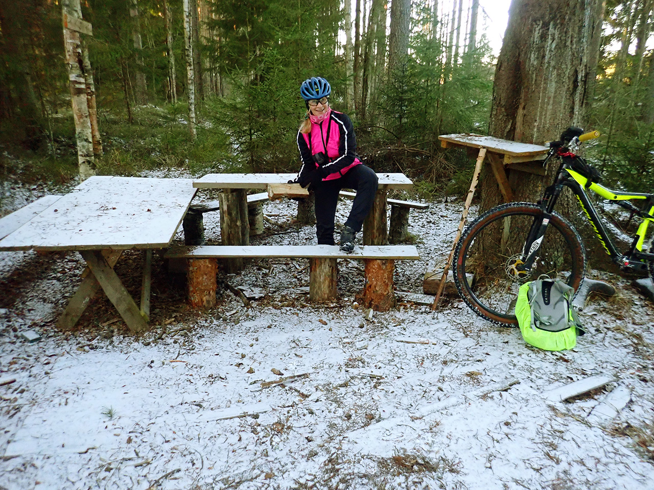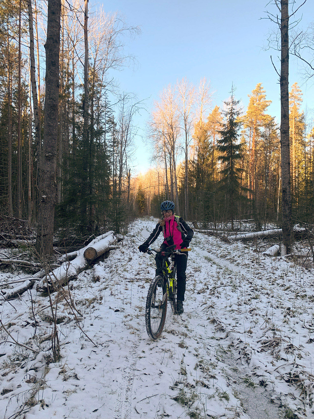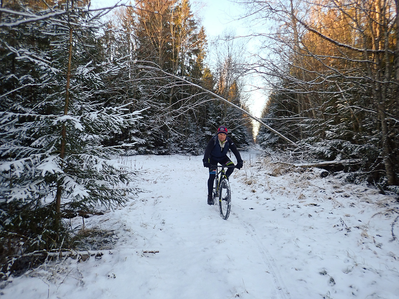 Так оно и было. Приятный поздний старт, сухие припорошенные снежком дороги, слегка подмерзшие лужи, кокетливо прячущийся под зимний окрас лес, хотя снега всего см2-3 было, причудливые тени и яркие краски от солнечного цвета, безукоризненное совсем не по ноябрьски голубое небо и полное погружение в тишину природы, несмотря на опять какашечный по километражу и времени маршрут (закончили в четыре), на часик уехали в лесок чаевничать, яблок поискать и церковь сфоткать в лучах заката :) В лесу на дорогах ехать было очень комфортно и интересно, даже на старых лесовозках :) Все объезжалось и проезжалось без мокроты. Единственный пеший участок с 1км был после прикольного преодоления ручья по бревну, там было много поваленных деревьев и просто прошли рядом по старой параллельно идущей квадровозке, там проще идти было чем ехать :) В полях к нам присоединился веселый мохнатый, пушистый белый пес, от компании которого спешно пришлось избавляться, заперев его ненадолго за оградой церкви :lol: