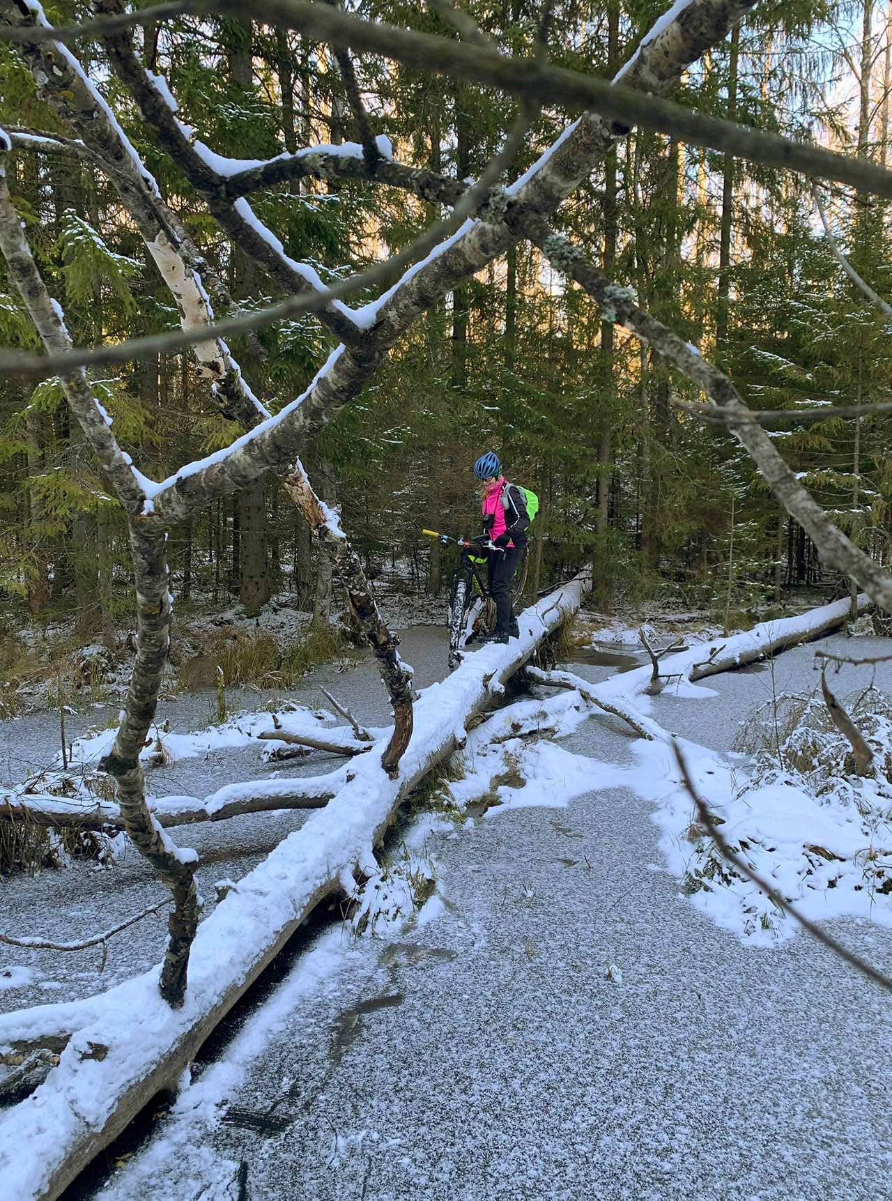 был очень эпичный переход заболоченного ручья через бобровую хатку и дальше по бревну, за минуту вполне уложились, хорошо велы легкие :D (фото от вадимки)