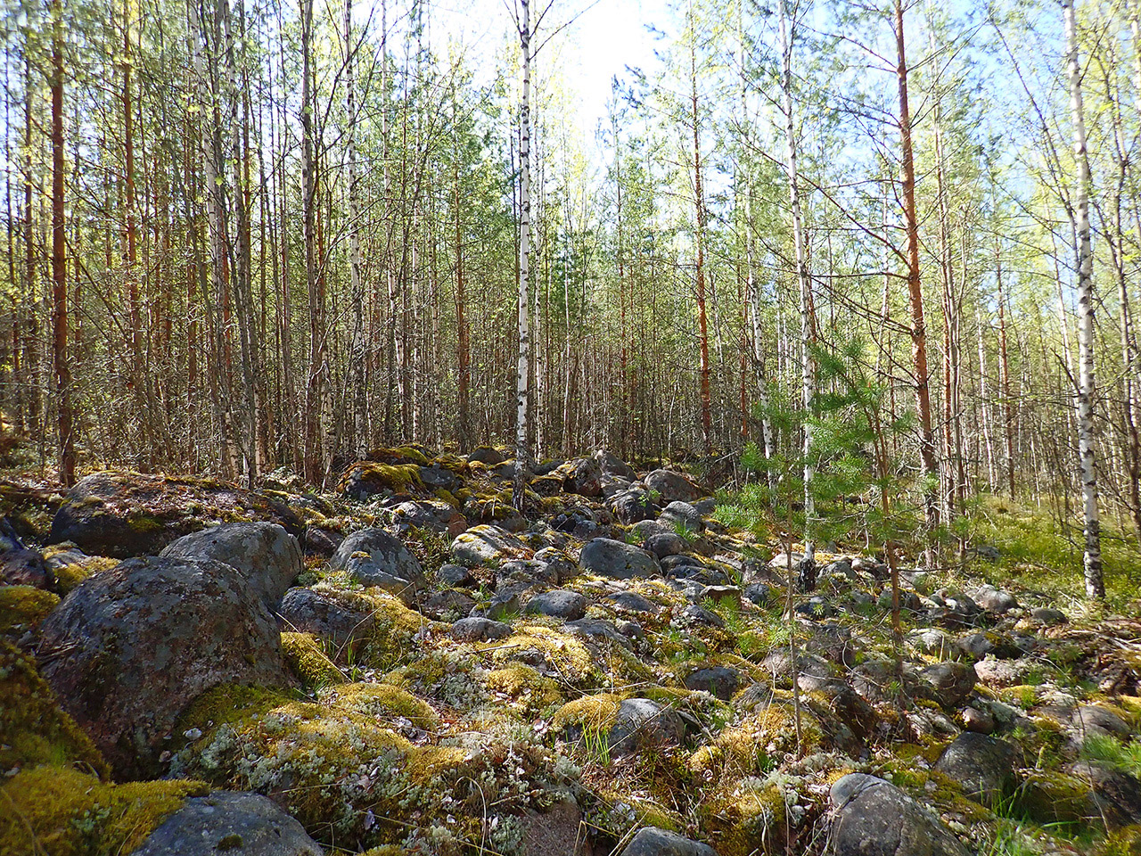 Зачем ехать было куда то далеко смотреть опять ледниковую гряду, когда она была прямо рядом! Хорошо что еще мерзкая зелень на деревьях только начинала вылезать и каскад камней можно было заметить. Вот тогда я забила на все и минут сорок лазала по древним камням, некоторые из которых зловеще пошатывались. Гряда шла по хребту наверное метров 500-700, точно подсчитать и пройти по ней невозможно, не ровен час шею свернуть шансы хорошие есть