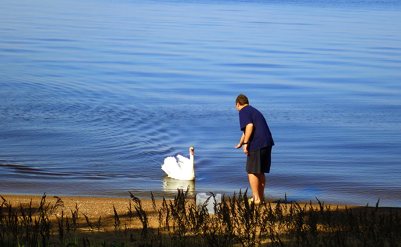 ), берегу Чудского озера. Там наконец можно было отдохнуть от зверствующих слепней и комаров, к вечеру их там почти не было. Словили закат средней красоты, полюбовались спокойными водами, просто тишь и гладь, но в воду не полезли, холодна она однако. Утром приплыл попрошайка лебедь-шипун, многодтный отец семейства шипунов, обитающих поблизости, но рыбы от нас так и не дождался, поплыл дальше клянчить ее у рыбаков